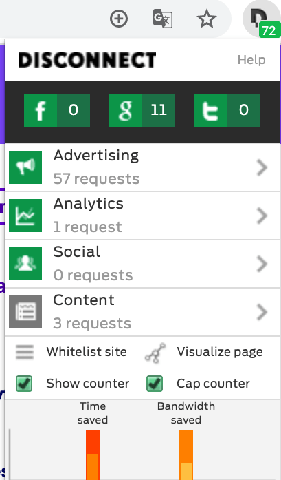 Po otro lado, tenemos la herramienta «Disconnect», que es una extensión del navegador que le permite al usuario saber qué fuentes de Internet están intentando acceder a su información y contenido en cada sitio web individual que visita. Además, la extensión le permite bloquear estas fuentes para que ya no obtengan información de usted. Bloquea las páginas que tratan de adquirir tu información e incluso te enseña qué paginas que trataron de accesar. Al utilizar esta herramienta pude obtener los siguientes resultados al realizar la búsqueda de Yahoo.com y ElVocero.com