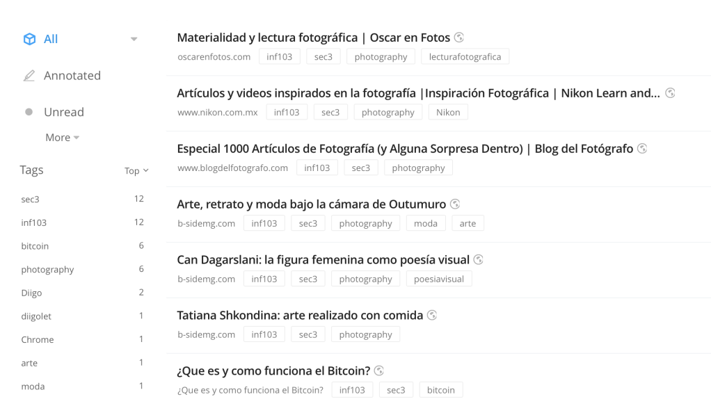 Aquí les dejo un link para mis enlaces de Diigo. Una aplicación maravillosa que nos deja almacenar enlaces, notas, imágenes y archivos para poder accesarlas de cualquier parte del mundo a través de la red de internet. Estoy haciendo este post ya que estoy haciendo un trabajo de Inteligencia Artificial para la Clase de Informatica, por ahora los enlaces van a estar relacionados con el tema. Además, Diigo tiene muchos beneficios para cosas como proyectos grupales y sé que lo utilizaré más adelante.